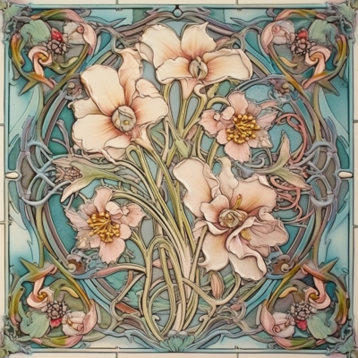 Il représente un bouquet de fleurs pastels dans le style Art nouveau.