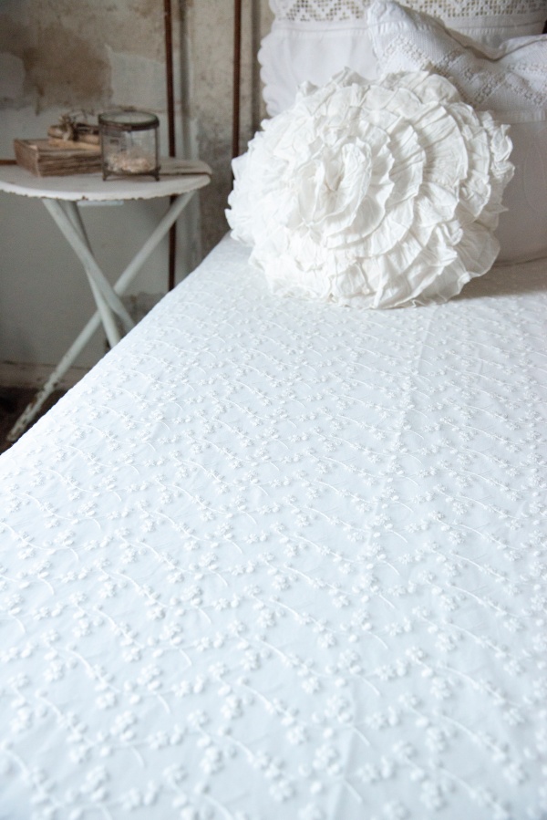 Superbe tulle rebrodé de petites fleurs en coton, de la marque Jeanne d’Arc Living.